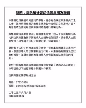 聲明:提防騙徒冒認信興集團及職員