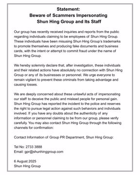Statement: Beware of Scammers Impersonating Shun Hing Group and Its Staff