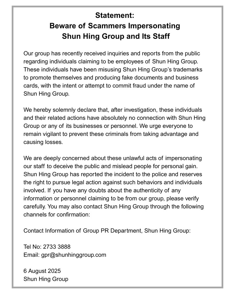 Statement: Beware of Scammers Impersonating Shun Hing Group and Its Staff