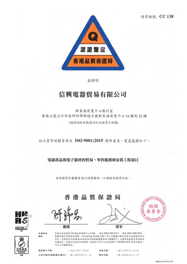 早在九十年代初,信興集團已開始採用「全面優質管理」。大部份的集團成員公司自一九九三年起陸續取得由獨立認證機構頒發的ISO9000系列的國際品質管理系統證書。香港品質保證局(HKQAA)更於二零零八年頒發「集團證書」予信興集團,以確認集團內各營運公司均已建立符合ISO9001要求的品質管理系統。信興集團憑著此基石來持續改善,精益求精。