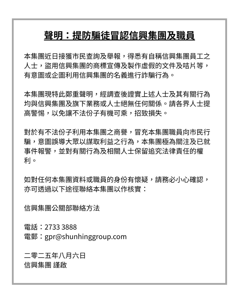 本集團近日接獲市民查詢及舉報,得悉有自稱信興集團員工之人士,盜用信興集團的商標宣傳及製作虛假的文件及咭片等,有意圖或企圖利用信興集團的名義進行詐騙行為。